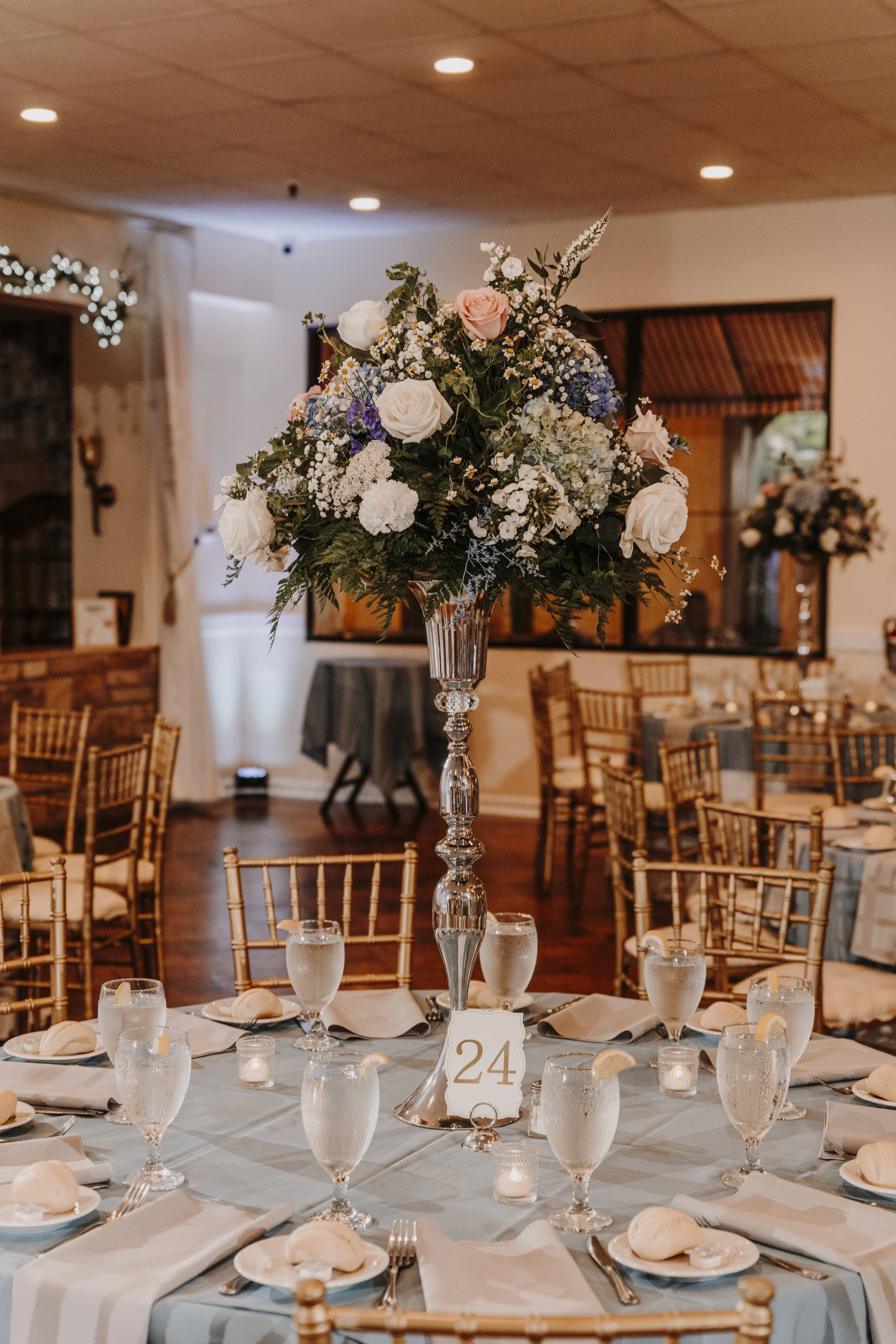 Gorgeous Decor - Color coordinated linens in 59 options, custom made fresh floral centerpieces, mr and mrs sign, cake stands, table numbers and more.